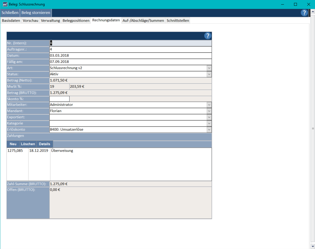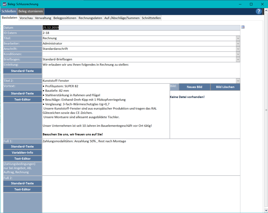 Reiter Verwaltung erweitert durch Reiter Rechnungsdaten und Auf-/Abschläge/Summen