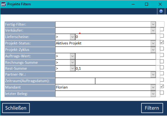 Detailformular zum Filtern von Projekten im Hauptformular Projekteübersicht.