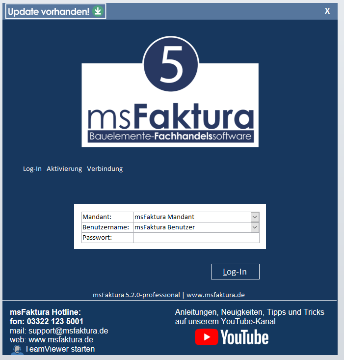 Dieses Detailformular öffnet sich nach dem Starten der msFaktura-Anwendung und ermöglicht nach Angabe der korrekten Anmeldeinformationen den Log-In.