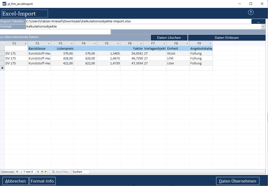 - „Daten Übernehmen“: Übernimmt nach Nachfrage die Daten in die Preismatritze