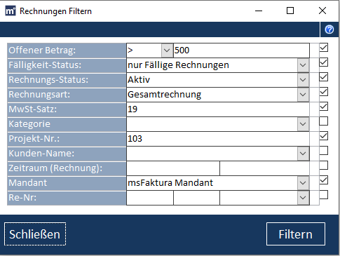Detailformular zum Filtern von Zahlungen.